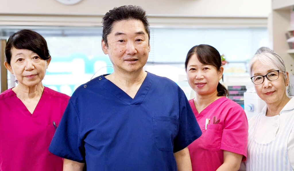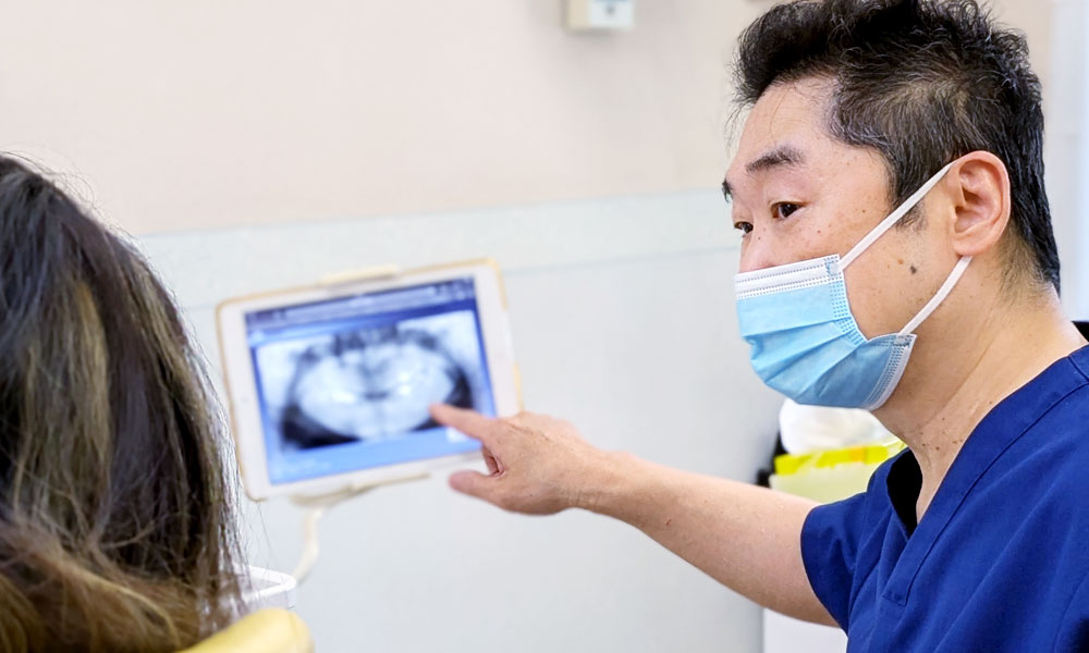 当院では、一般歯科はもちろん、歯周病・インプラント・かみ合わせ・部分矯正・審美歯科まで、幅広くお口全体の治療を計画的に行っています。特に、歯周病は専門分野で、重症のケースでも治療を行えます。